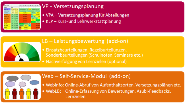 Das Basisodul VP - Versetzungsplanung ermöglicht Ihnen, auf der Basis des Ausbildungsplans für jeden Einsatz den Eingang von Beurteilungen, Berichten oder auch Azubi-Feedbacks zu erfassen und überfällige Unterlagen per indivdueller Serienmail bei Bedarf nachzufordern. Per Mausklick können Sie den aktuellen Aufenthaltsort Ihrer Azubis abfragen, auf einen Blick sehen Sie, welche Lerninhalte - unter Berücksichtigung von Lehrjahren - geplant oder eventuell schon überfällig sind.